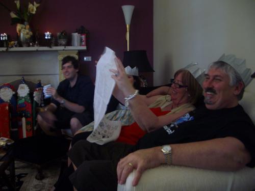 Am feierlich dekorierten Tisch gab es zuerst Knallbonbons mit silbernen Kronen, die wir den Rest des Tages auf dem Kopf trugen. Es folgte le Festmenue: Kartoffelgratin, Rucola Salat, diverses gebackenes Gemuese, dazu turkey, chicken und pork kalt in Scheiben. Besonders stolz war Sarah's mum, dass sie beim "Strudelking" einen echten German Strudel gekauft hatte. Der war mit Gemuese gefuellt und weder Silke noch ich kannten dieses Essen. War aber sehr lecker.