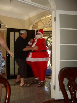 Uncle Peter hatte sich in ein aufblasbares Santa-Kostuem gekleidet und Bart und Muetze aufgesetzt. Santa brauchte allerdings Hilfe beim Verteilen der vielen Geschenke aus seinem Sack, denn im Sitzen konnte er kaum ueber seinen riesigen luftgefuellten Bauch blicken. Ein Riesenspass!